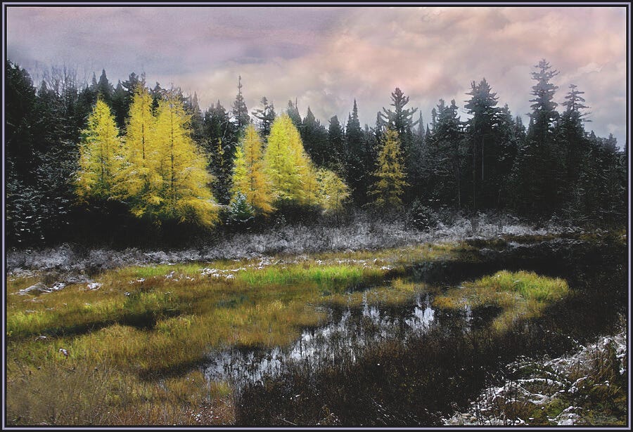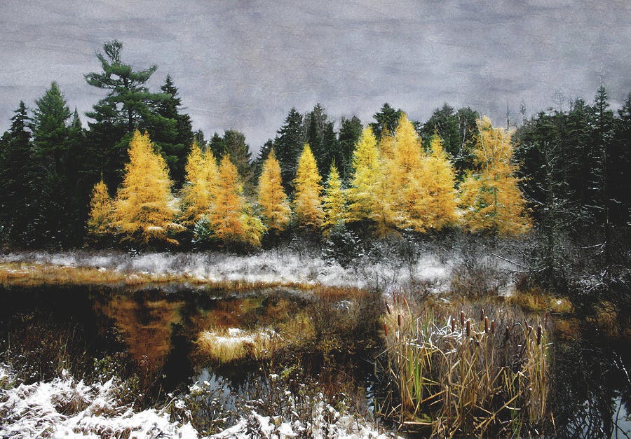 | Cattails and Tamarack Under Painted Sky Signed Original Art Available in two different sizes |
