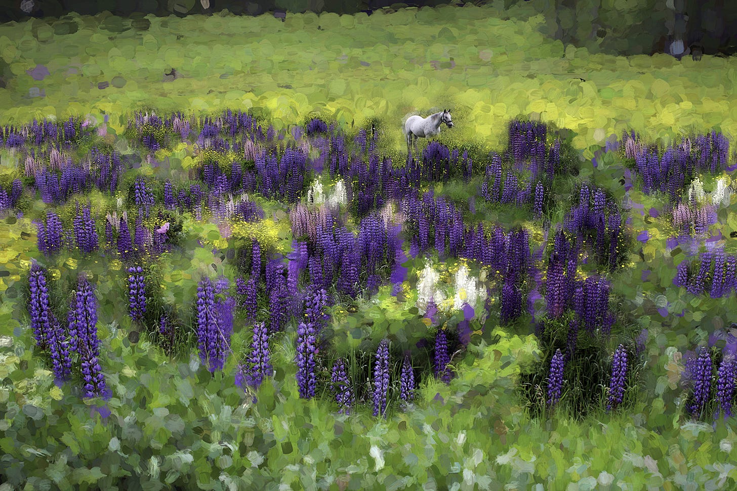 White Horse in a Blue Lupine Field